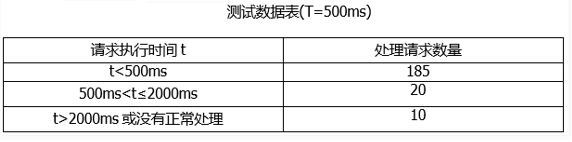 承运商竞拍部分的性能要求最高。采用性能测试工具在以系统竞拍功能为主进行性能测试时,采用Apdex(应用性能指数)对用户使用该系统的性能满意度进行度量,系统需要满足Apdex指数为0.9以上。测试数据如下表所示,请计算本系统的Apdex指数,并说明本系统是否达到要求。