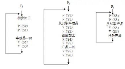 最后我们再看一下P3的流程,从成品箱B2取出产品并检验产品时,先执行两个P操作,对应两个信号量S6和S5,结合P2的操作流程,说明S6也是同步信号量,道理和S3一样,初始值为0。然后再执行两个V操作,对应两个信号量S5和S4。表示每从成品箱B2取出一件成品时,信号量S4执行一次V操作,表示产品箱B2的容量加1。