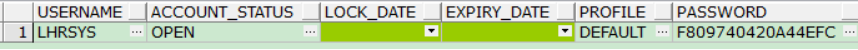 1SYS@lhrdb> SELECT USERNAME, ACCOUNT_STATUS,EXPIRY_DATE,LOCK_DATE FROM DBA_USERS WHERE USERNAME = 'LHRSYS';