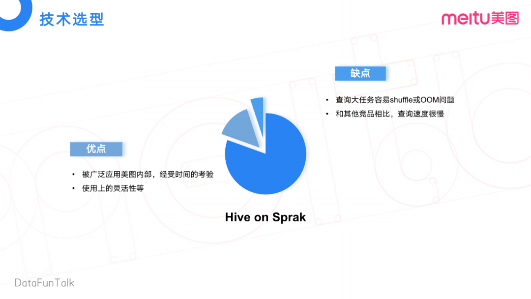 Hive on Spark的优点,首先是在美图内部广泛使用,经受住了时间的考验。其次是使用上的灵活性,因为已经使用了很多年,相对比较熟悉,做过较多二次改造,包括源码增强和一些重点模块重构。