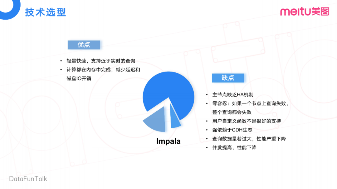 但缺点也比较多,首先是主节点缺乏高可用的机制(HA机制)。其次是零容忍问题,即一个查询发送过来的话,如果其中一个节点查询失败,会导致整个查询都失败。再次,我们在使用过程中发现它对自定义函数支持的不是很好。另外,Impala强依赖于CDH的生态,跟我们现有架构不能很好的融合。我们现有架构使用了一些开源社区的组件。如果强依赖于CDH, 当我们要做版本升级、补丁升级或者代码重构后的升级时,存在过度依赖CDH而操作不友好的问题。最后,就是查询数据量过大的话,会发生比较严重的性能下降。此外,还有对于并发的支持,不是特别好。