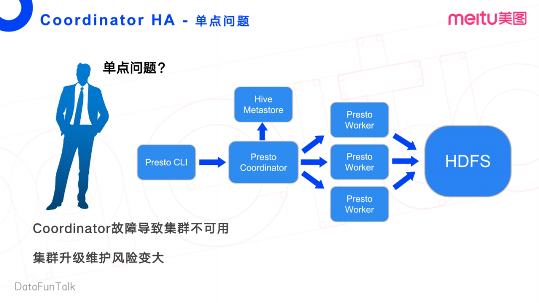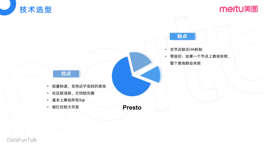 当然Presto也有一些缺点,一是零容忍问题,如果一个失败,一个节点上的查询失败,会导致整个查询的失败。再就是主节点缺乏HA的机制。HA这个缺点,业界也有方案可以去完善。在下一个章节,会分享美图是如何完善HA机制的。