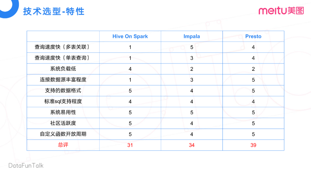 我们通过对比三个组件的一些特性,包括多表关联、单表查询和系统负载等,得到了一个打分。分数越高越适合我们的业务场景,优势越明显。表格中可以看到,Presto总计39分是最高的,最符合我们的业务场景。