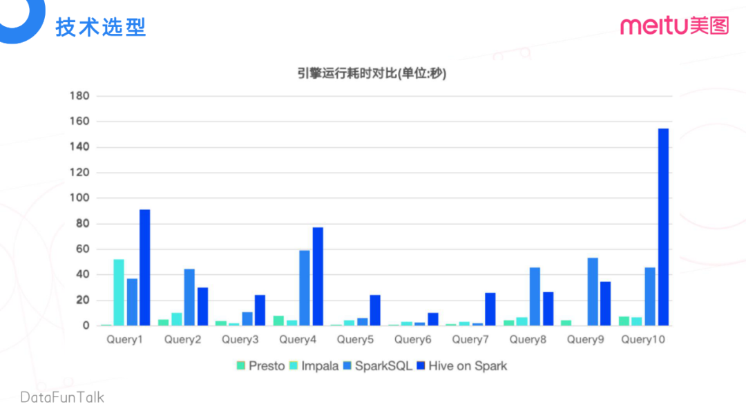 同时我们也做了计算性能上的对比。Presto的性能最好,Impala略微差一些。可能比较细心的同学会发现,在Query 9里面,Impala的结果是空白的,这是因为Impala不兼容Query 9中的语法。这里面我们也对比了在美图内部用的比较多的Spark SQL,由于上篇文章没讲到Spark SQL,所以这里只做了一个性能的比较。基于这些维度考虑,我们最终选择了Presto。