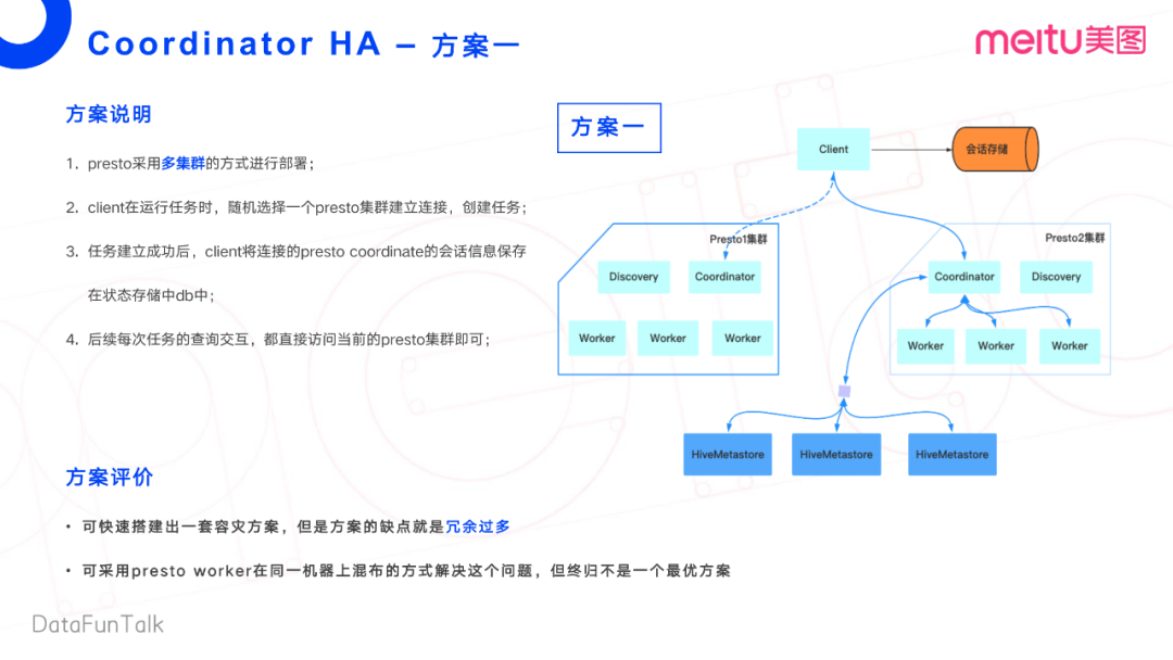 这里稍微点一下,这边Meta Store有三台机器,是为了实现高可用。Coordinator接收到任务,会去获取任务的一些源数据信息。此时通过三个Meta Store进行轮询选择。当一台Meta Store挂掉之后,还有两个实例可以用。这个方案一被pass掉了,因为不能接受它的冗余。