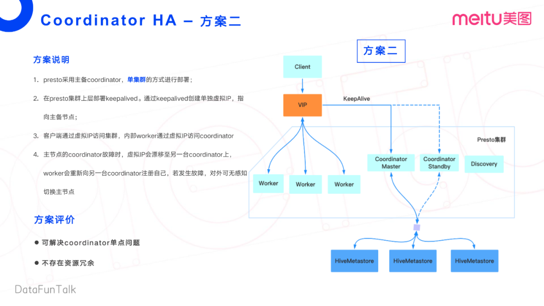 接下来看方案二,Presto采取了一个主备的Coordinator单集群部署方式。这个是大规模集群比较常见的部署方式。
