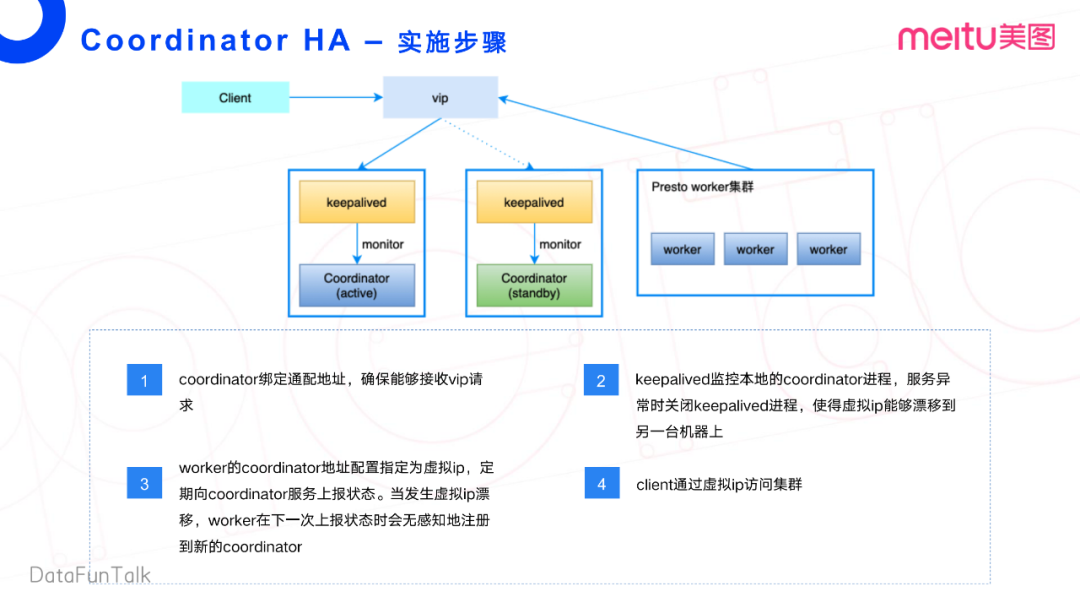 可能会有点绕,大家只要记住,Coordinator和Worker都是通过这个VIP去进行关联与信息交互。在网上,这个方案也相对比较成熟,具体的代码和配置都可以找到。