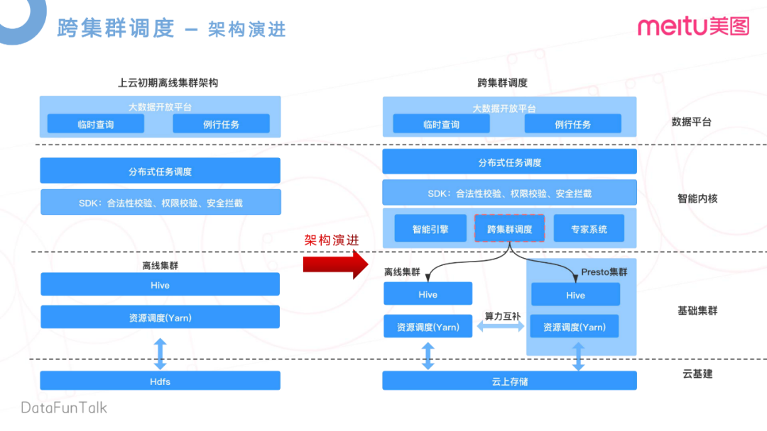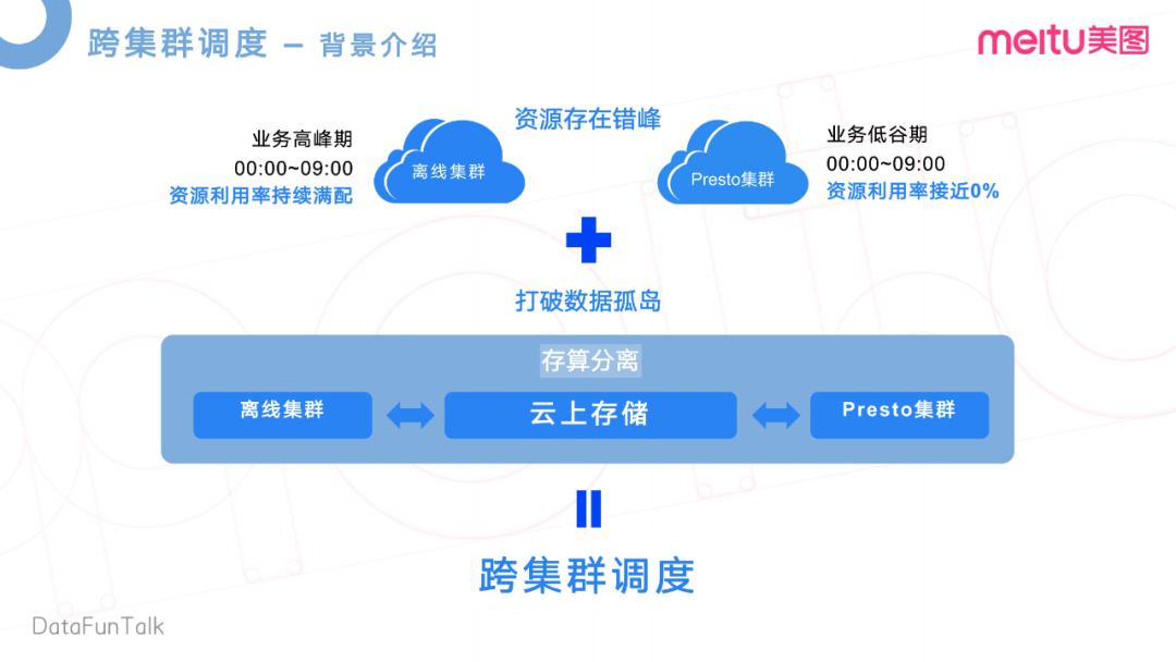 美图在去年完成了一个上云的操作,在云上使用了存算分离的架构,实现了数据的统一存储。这样的好处是打破了传统架构的数据孤岛的问题,离线集群和Presto集群可以无差别的访问云上的存储,即离线集群可以访问到Presto集群上的数据,Presto上的数据也可以访问到离线集群的数据。基于这两点,我们就提出了一个跨集群调度的概念,去减轻离线集群的高峰负载,提升Presto集群凌晨业务低谷资源使用率。