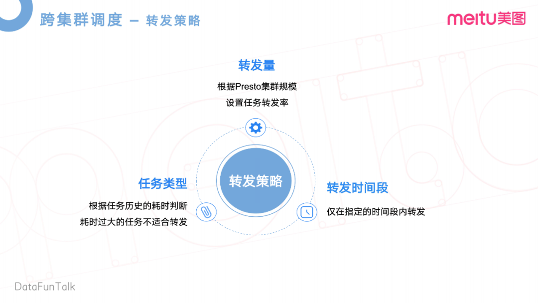 在实现跨区域调度之后,团队内部研发了一个智能内核。智能内核其实里面有三个比较核心的东西,一个是智能引擎,也就是和团队现在一起在做的事情。跨集群调度就是通过这个任务根据评估离线集群和Presto集群的一个业务集群负载,去转发到各自的集群,去分担各自的集群压力,或者说提升一个资源的利用率。这边也实现了一个算力互补的这么一个东西,当然最底层是通过我们的云基建,云上存储进行实现的。当然我们在评估这个转发,就是什么样的任务可以去转发到Presto上呢,我们也做了一些简单的转发策略,比如说转发量上,我们会根据Presto集群规模,去设置一些离线任务的转发率。