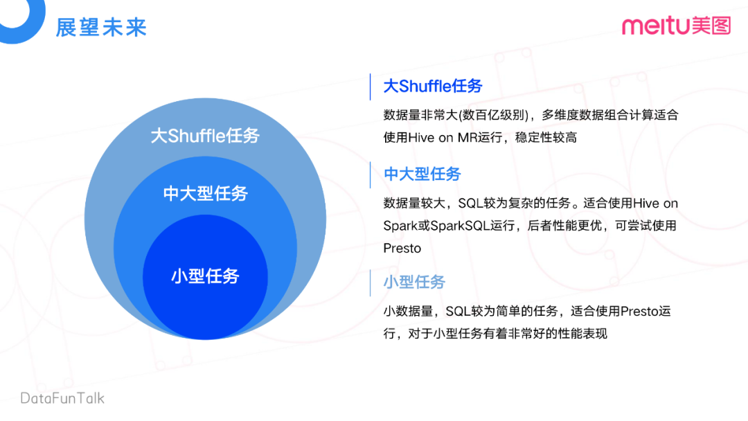 用一句话来总结:对于中大型任务和小型任务,会将原来的Hive on Spark或者Spark SQL的运行方式,逐步切换到Presto上,来达到性能提升的目的。