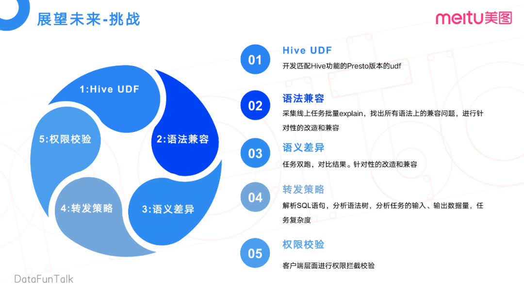 比如某个任务,在离线集群上用了一个Hive UDF,在Presto上也要实现对应的UDF。现在这个完全是靠人力去开发对应的UDF。当然,后面也在想一些更好的方式,如何去快速的适配Hive上已有的UDF。