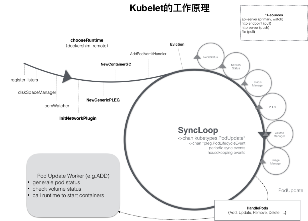 kubelet 本身,也是按照“控制器”模式来工作的。它实际的工作原理,可以用如下所示的一幅示意图来表示清楚。