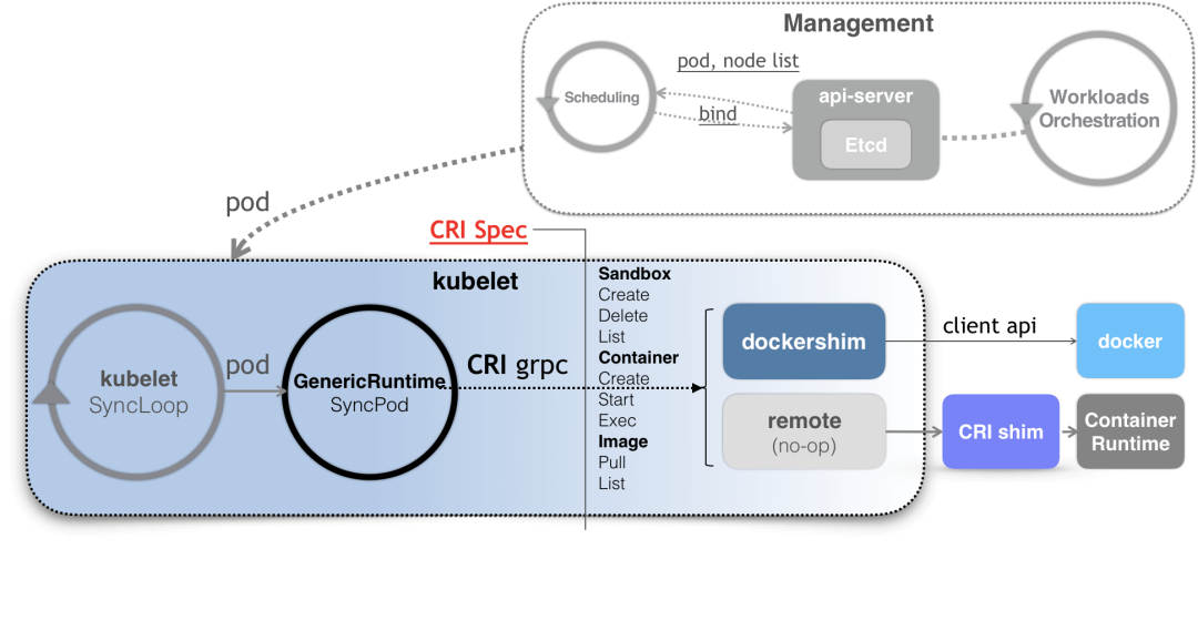 如果是外部外部容器运行时的时候,需要在每台宿主机上单独安装一个负责响应 CRI 的组件。这个组件就是CRI shim,需要包含网络插件CNI。比如支持containerd的CRI-Containerd的shim。到了 containerd 1.1 版本后就去掉了 CRI-Containerd 这个 shim,直接把适配逻辑作为插件的方式集成到了 containerd 主进程中,所以我们现在可以直接使用--container-runtime-endpoint=unix:///run/containerd/containerd.sock这个套接字,就可以无缝切换的containerd。