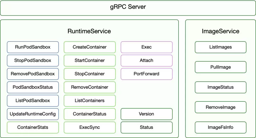 Container Runtime实现了CRI gRPC Server,包括RuntimeService和ImageService。该gRPC Server需要监听本地的Unix socket,而kubelet则作为gRPC Client运行。CRI 接口包括 RuntimeService 和 ImageService 两个服务,这两个服务可以在一个 gRPC server 中实现,也可以分开成两个独立服务。目前社区的很多运行时都是将其在一个 gRPC server 里面实现。这其中包含了两个gRPC服务: