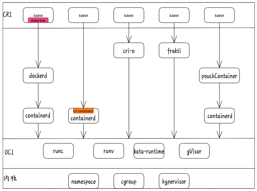 我们最初在使用Kubernetes时通常会默认使用Docker作为容器运行时,其实从Kubernetes 1.5开始已经开始支持CRI,目前是处于Alpha版本,通过CRI接口可以指定使用其它容器运行时作为Pod的后端,docker、containerd、CRI-O、Frakti、pouch,它们衔接Kubelet与运行时方式对比如下: