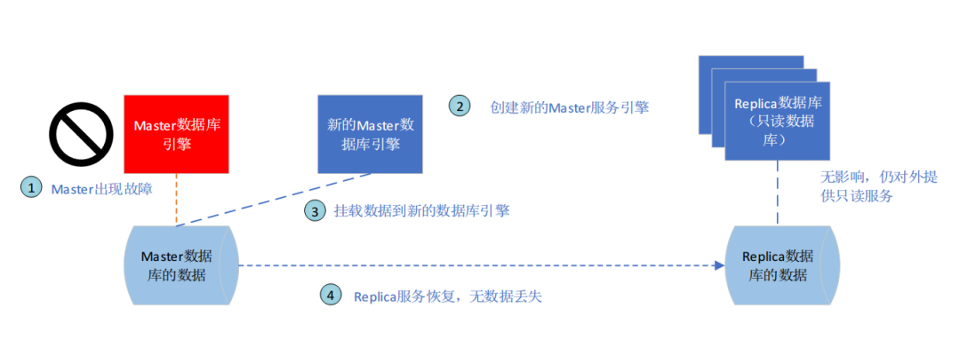 当数据库集群通过云服务商初始化完成之后,在Cloud集群管理器中将记录该集群的信息,包括IP,端口以及缺省数据库等信息,并将用户名和密码发送到申请集群是设置的email。该集群初始化完成之后,信息将显示到WebAdmin上,用户可以通过WebAdmin对集群进行管理(启动,停止,监控等)。授权的用户可以通过WebAdmin管理创建数据库实例,并使用数据库。如果云服务商提供了存储管理,并将存储与应用分开,那么当master数据库故障的时候,切换过程如下图所示: