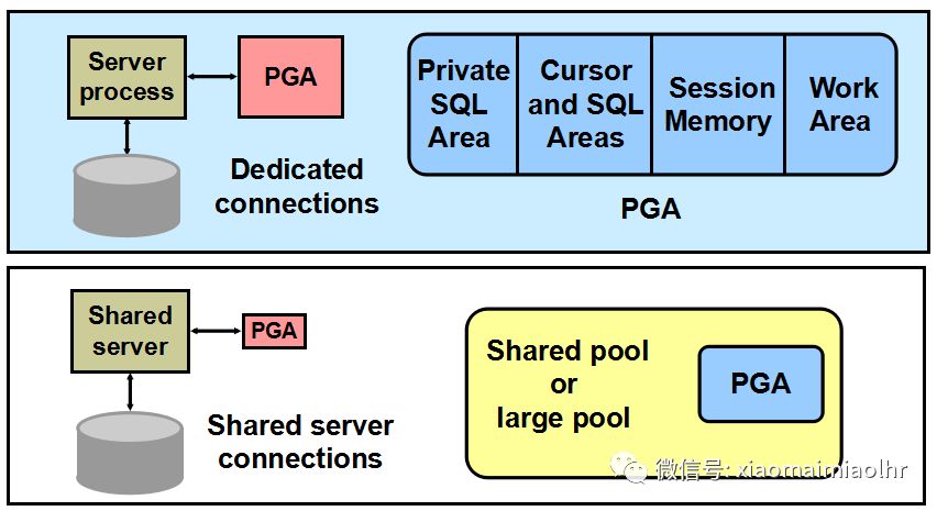 l 私有SQL区(Private SQL Area):包含当前会话的绑定信息以及运行时内存结构。每个发出SQL语句的会话,都有一个Private SQL Area。当多个用户执行相同的SQL语句,此SQL语句保存在共享SQL区。若是共享服务器模式,则Private SQL Area位于SGA的Share Pool或Large Pool中。若是专用服务器模式,则Private SQL Area位于PGA中。