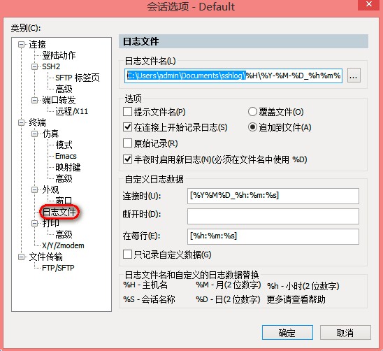 日志文件名:C:\Users\admin\Documents\sshlog\%H\%Y-%M-%D_%h%m%s.log