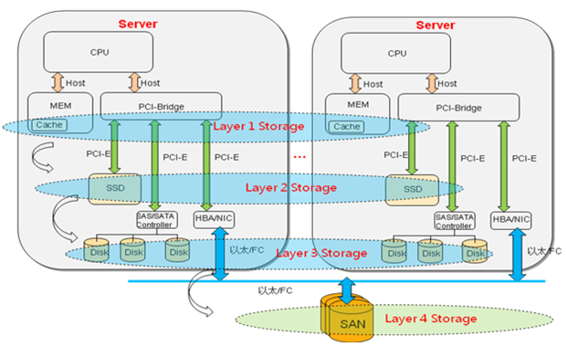 该层既可以作Cache用(因为SSD固态硬盘的速度也很快),也可以作最终存储用(因为现在的SSD固态硬盘容量也不小);同时,SSD固态硬盘不存在机械损坏故障风险,因此该层主要用于中高端数据库等业务;
