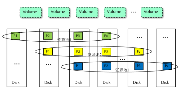 分布式存储系统,把所有服务器内的本地磁盘,整合成了一个或多个庞大的存储资源池,基于该存储资源池,进行统一的创建/删除卷(Volume),创建/删除快照等操作,为上层软件提供卷设备功能;这个庞大的存储资源池,结构如下: