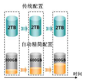 厚配置的存储空间利用率较低,如上图所示,用户一开始可能没有那么多的数据要存储,但是一直占用所有的存储空间(一直占用2TB存储空间),空余的存储空间,就得不得利用;精简配置,可以一开始为用户分配300GB存储空间,其余存储空间可以给其他用户使用,后续用户的数据越来越多,再灵活增加用户的存储空间(300GB->600GB->900GB)。