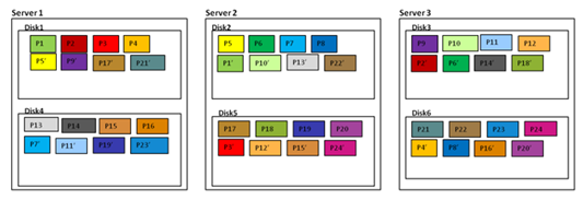 根据上图所示,可以看到数据P1存放于服务器1的磁盘1,而其副本P1存放于服务器2的磁盘2;这样如果有服务器故障,引起数据丢失,可以根据其它服务器磁盘上的副本数据,进行数据恢复;集群管理:该技术确保集群内有服务器添加或移除,均不影响整个系统业务的平稳运行。