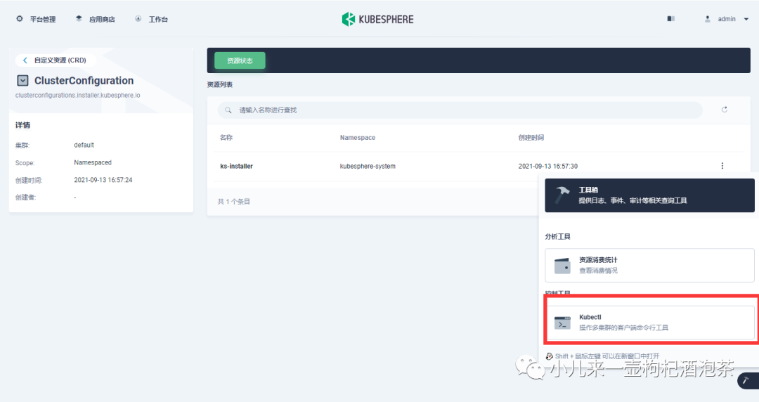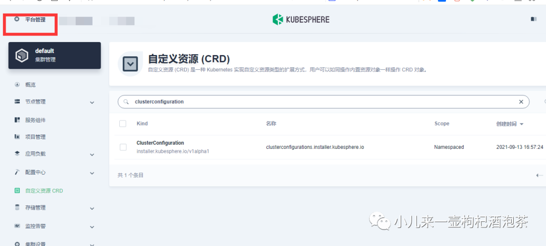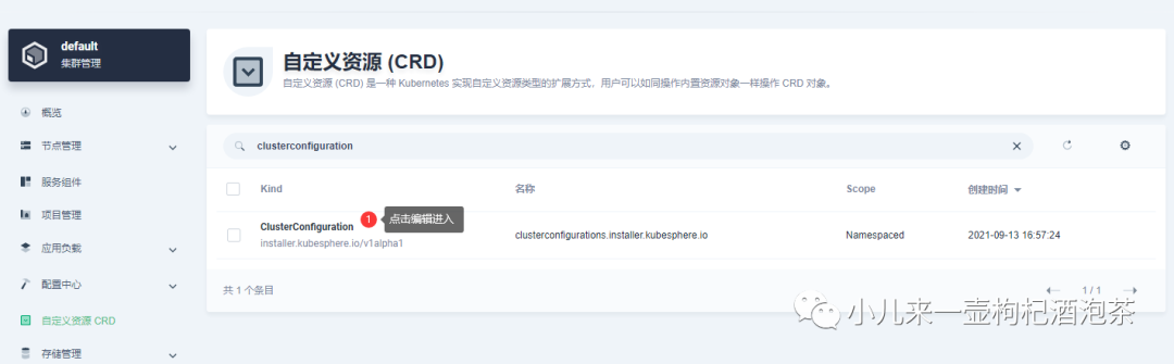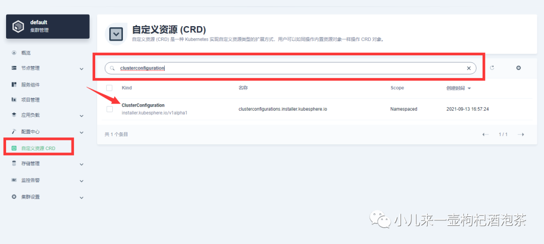点击自定义资源 CRD,在搜索栏中输入 clusterconfiguration,点击结果查看其详细页面。
