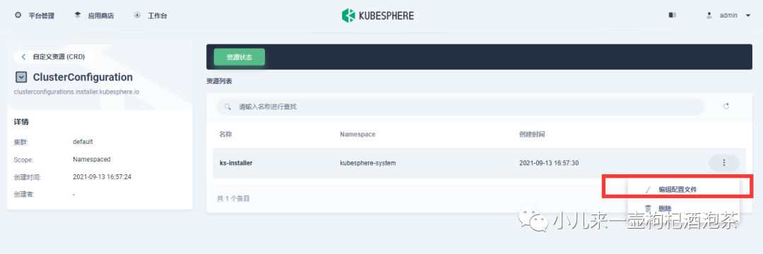 在资源列表中,点击 ks-installer 右侧的 ,选择编辑配置文件。