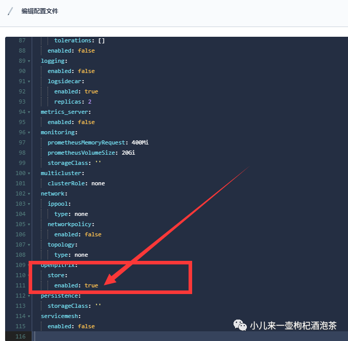 在该 YAML 文件中,搜寻到 openpitrix,将 enabled 的 false 改为 true。完成后,点击右下角的更新,保存配置。