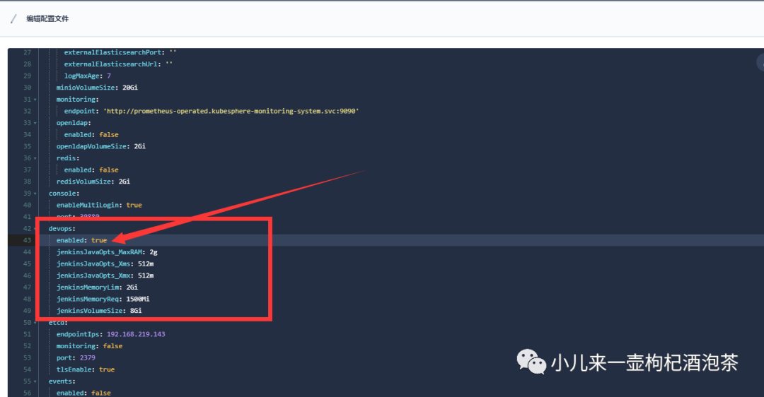 4:在该 YAML 文件中,搜寻到 devops,将 enabled 的 false 改为 true。完成后,点击右下角的更新,保存配置。
