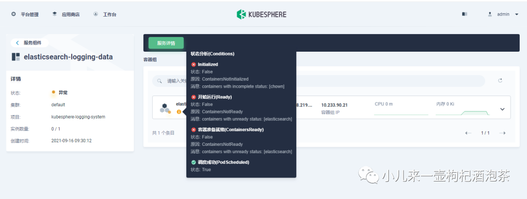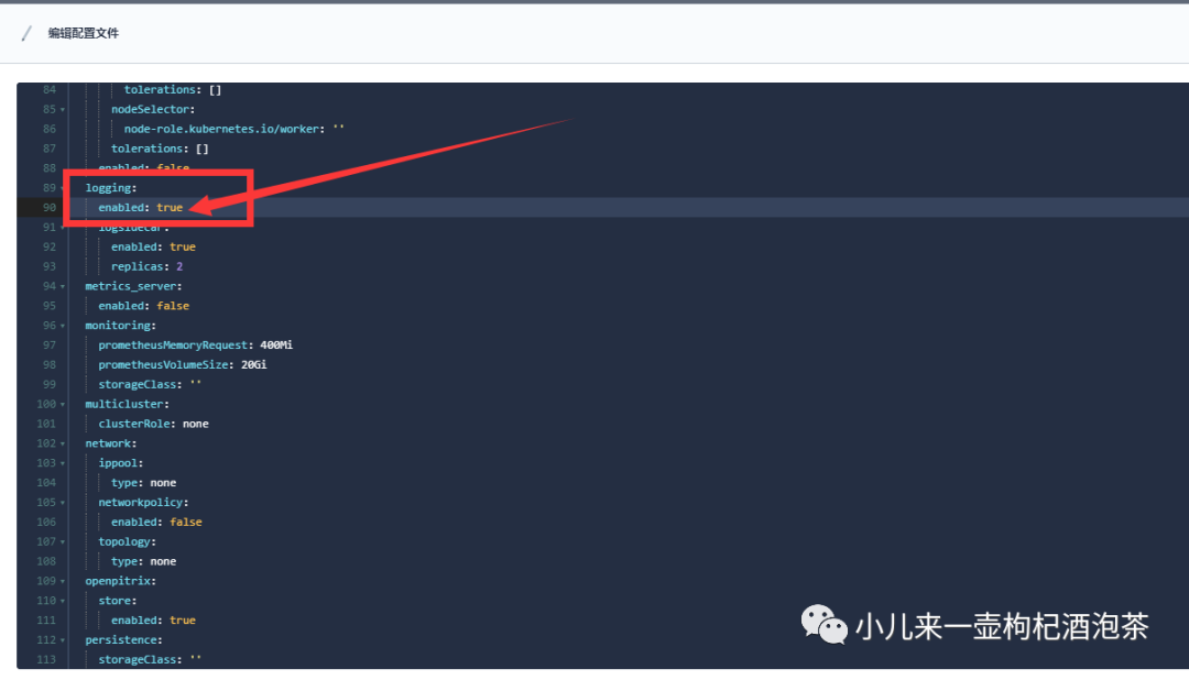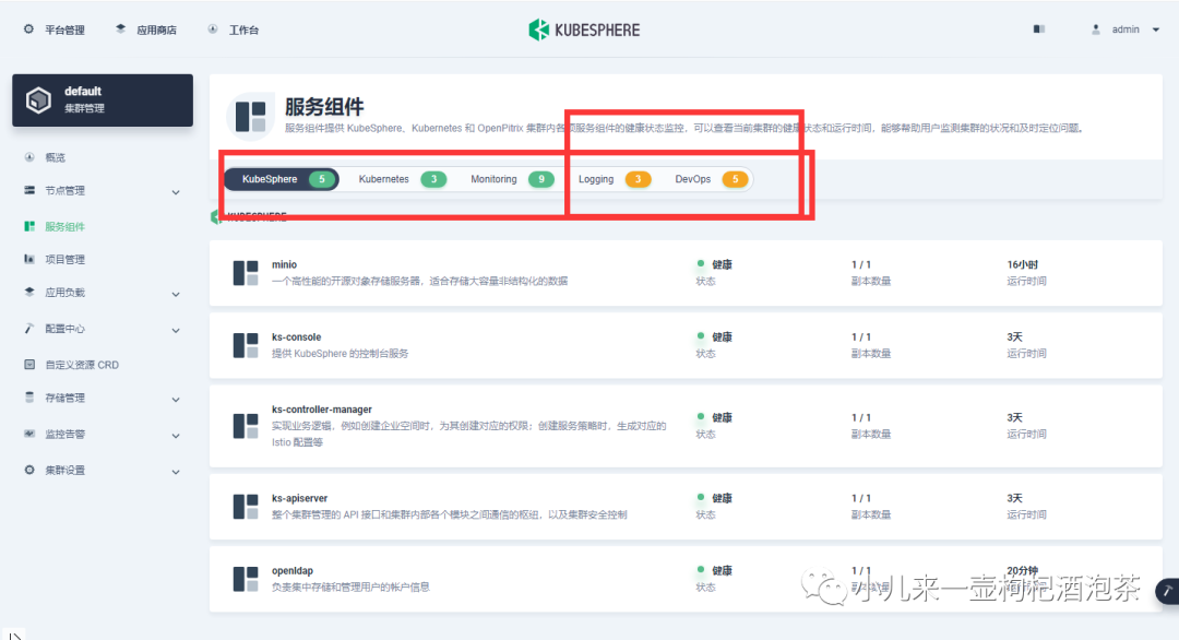 由于我们最初开始安装kubesphere的时候是最小化安装的大部分的插件是没有安装上的,所以需要再配置里修改再开启相关的插件。