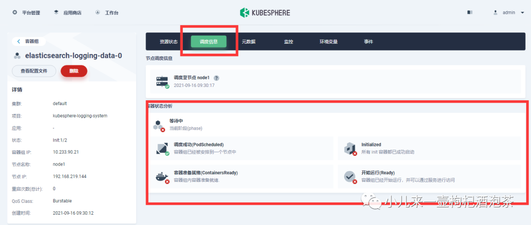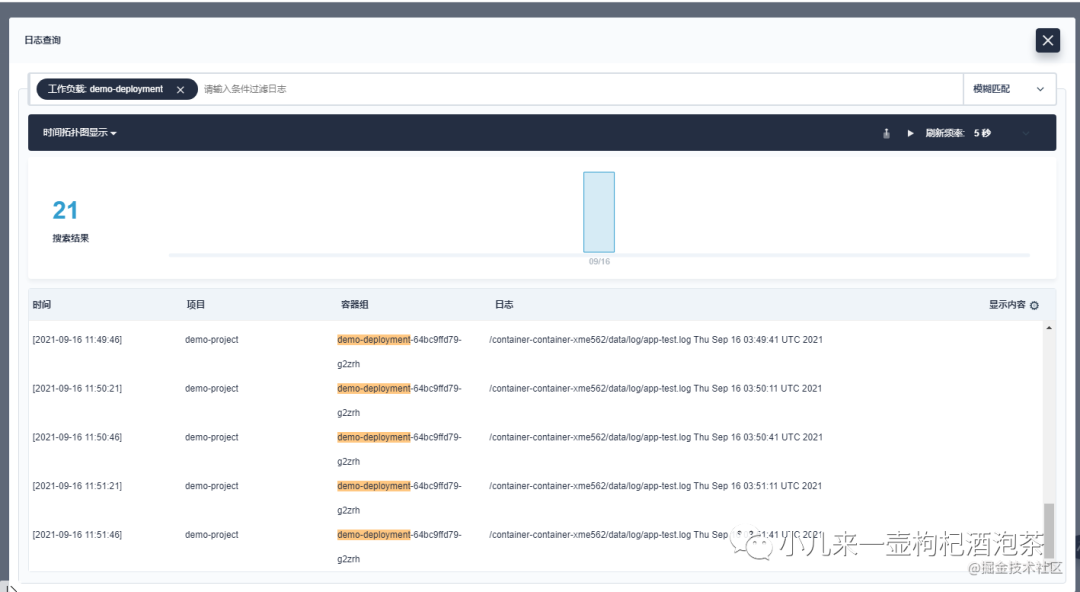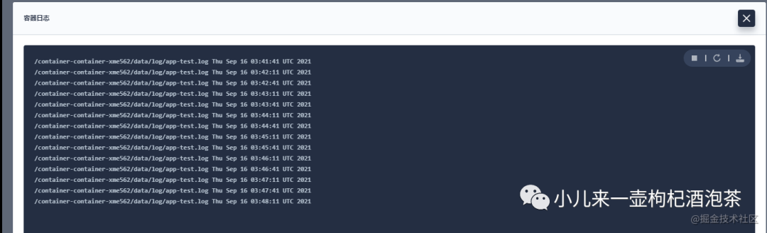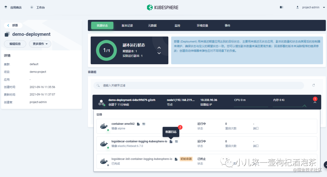 在资源状态中,点击右侧的箭头查看容器详情,然后点击 logsidecar-container
