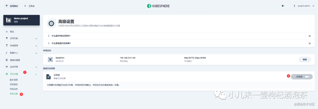 在左侧导航栏中,选择项目设置中的高级设置。在落盘日志收集一栏下,通过切换开关以启用该功能。