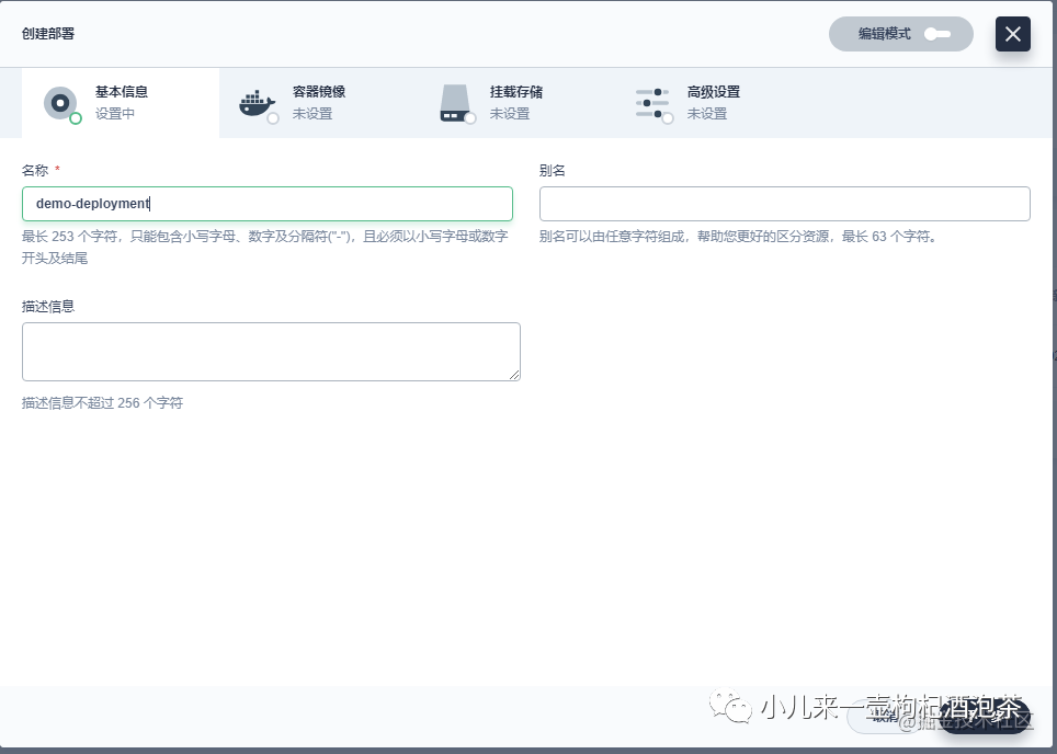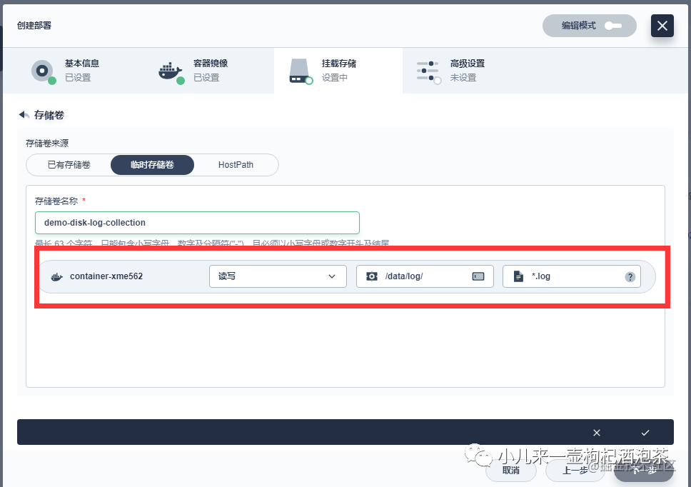 在临时存储卷选项卡下,输入存储卷名称(例如 demo-disk-log-collection