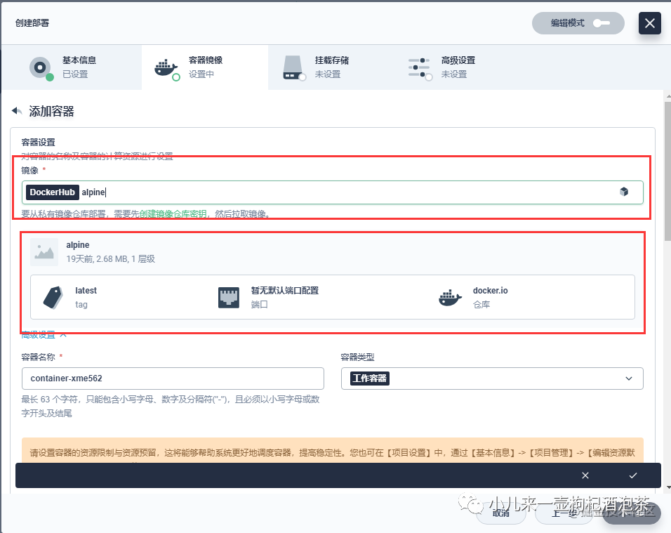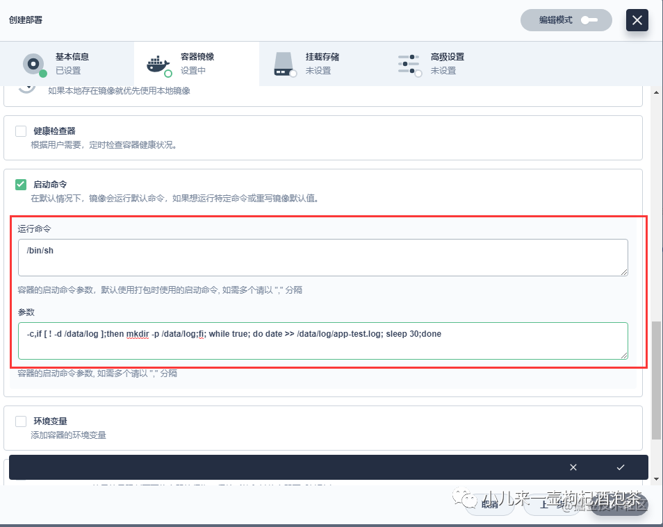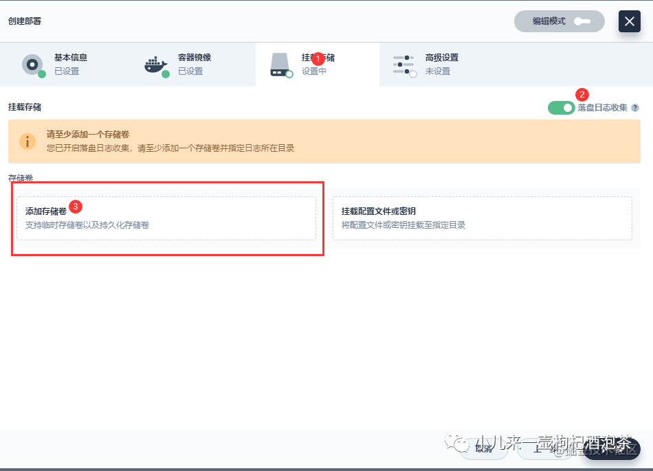 在挂载存储选项卡下,启用落盘日志收集,点击添加存储卷。