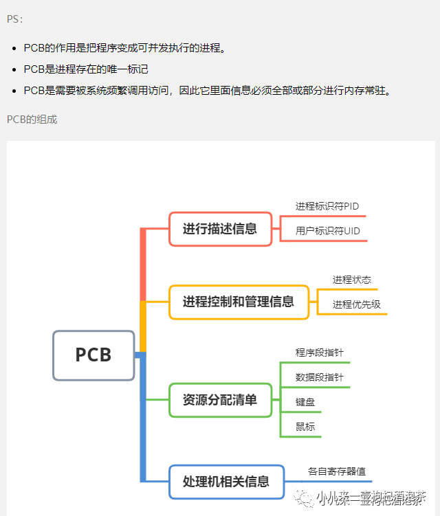 PCB:操作系统通过PCB来管理进程,它包含的是操作系统对进程管理所需的各自信息的一个数据结构体。