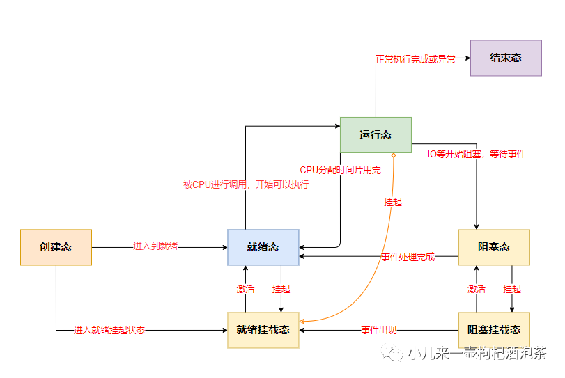 PS:与挂起态相比,阻塞态是一种被动行为,它是在等待事件或者获取不到资源而引发的等待表现。可以理解为我们的说的同步IO阻塞。