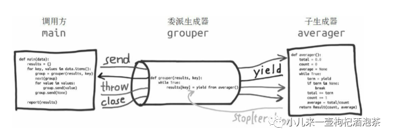 双向通道: 调用方main可以通过send()直接发送消息给子生成器averager,而averager子生成器yield的值,也是直接返回给main调用方。