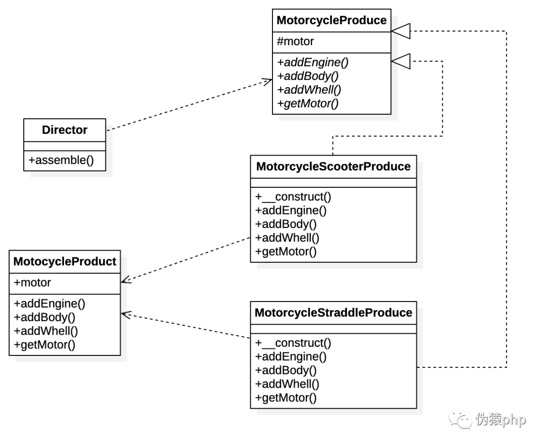 <?php//抽象类-定义生产摩托车流水线标准abstract class MotorcycleProduce{protected $motor;//发动机方法public abstract function addEngine();//车身方法public abstract function addBody();//车轮方法public abstract function addWhell();//获取摩托public abstract function getMotor();}/*** 踏板摩托组装*/class MotorcycleScooterProduce extends MotorcycleProduce{public function __construct(){$this->motor = new MotocycleProduct();}public function addEngine(){$this->motor->addEngine("踏板摩托-发动机已装好");}public function addBody(){$this->motor->addBody("踏板摩托-车身已装好");}public function addWhell(){$this->motor->addWhell("踏板摩托-车轮已装好");}public function getMotor(){return $this->motor;}}/*** 跨骑摩托组装*/class MotorcycleStraddleProduce extends MotorcycleProduce{public function __construct(){$this->motor = new MotocycleProduct();}public function addEngine(){$this->motor->addEngine("跨骑摩托-发动机已装好");}public function addBody(){$this->motor->addBody("跨骑摩托-车身已装好");}public function addWhell(){$this->motor->addWhell("跨骑摩托-车轮已装好");}public function getMotor(){return $this->motor;}}//安排生产线开始组装摩托class Director{public function assemble(MotorcycleProduce $motorcycleProduce){$motorcycleProduce->addEngine();$motorcycleProduce->addBody();$motorcycleProduce->addWhell();}}//摩托车产品本身class MotocycleProduct{private $motor = ["engine"=>"","body"=>"","whell"=>""];//新增发动机零部件public function addEngine($engine){$this->motor["engine"] = $engine;}public function addBody($body){$this->motor["body"] = $body;}public function addWhell($whell){$this->motor["whell"] = $whell;}//获取完整摩托对象public function getMotor(){return $this->motor;}}//分配任务管理者$director = new Director();//踏板摩托车$motorcycleScooterProduce = new MotorcycleScooterProduce;$director->assemble($motorcycleScooterProduce);$motorcycleScooter = $motorcycleScooterProduce->getMotor();var_dump($motorcycleScooter);echo "<br>";//跨骑摩托车$motorcycleStraddleProduce = new MotorcycleStraddleProduce;$director->assemble($motorcycleStraddleProduce);$motorcycleStraddle = $motorcycleStraddleProduce->getMotor();var_dump($motorcycleStraddle);