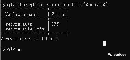 # 判断 secure_file_priv 值show global variables like '%secure%';