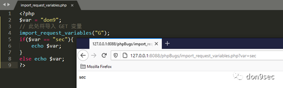 将 GET/POST/Cookie 变量导入到全局作用域中(相当于开启全局变量注册), 所以如果禁止了 register_globals,但又想用到一些全局变量,则可以使用该函数。语法:import_request_variables(string $types ,string $prefix )