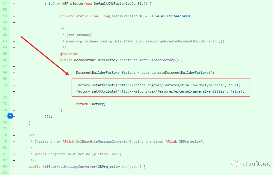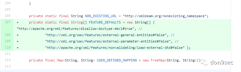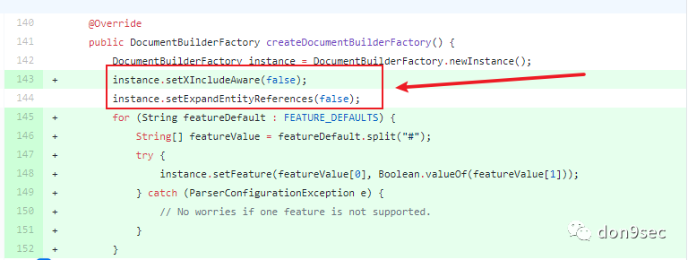 给DocumentBuilderFactory设置了参数,阻止外部实体的引入,禁用inline DOCTYPE声明,防止了XML实体注入。