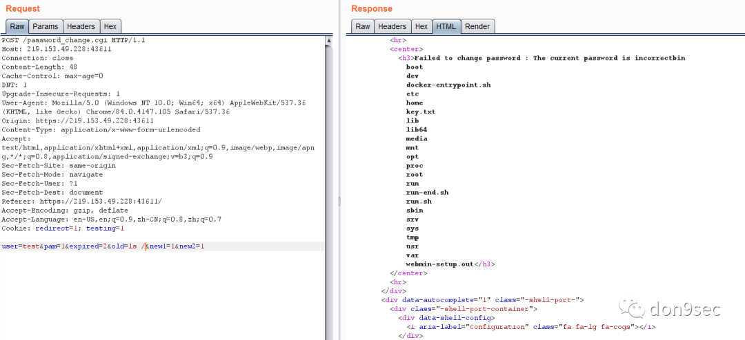 Webmin是目前功能最强大的基于Web的Unix系统管理工具。管理员通过浏览器访问Webmin的各种管理功能并完成相应的管理动作。据统计,互联网上大约有13w台机器使用Webmin。当用户开启Webmin密码重置功能后,password_change.cgi中的old参数处有一个命令注入漏洞。攻击者可以通过POST请求中利用该参数在目标系统中执行任意命令,且无需身份验证。