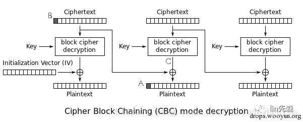 攻击者能够获得密文(Ciphertext),以及附带在密文前面的IV(初始化向量)