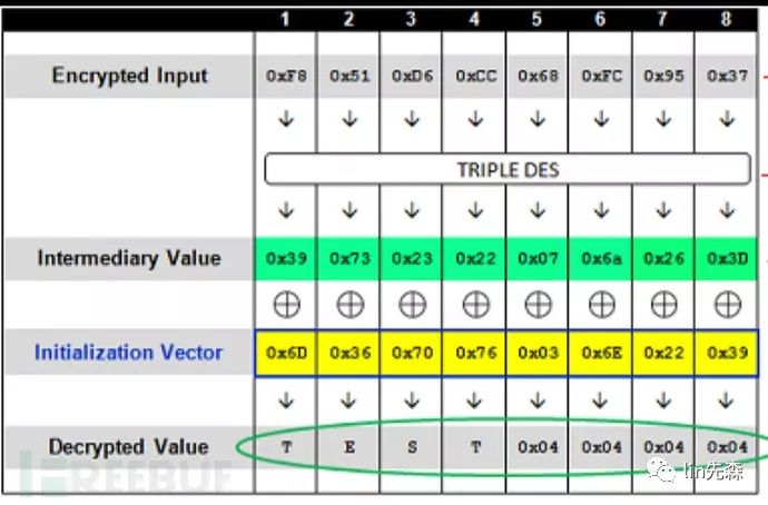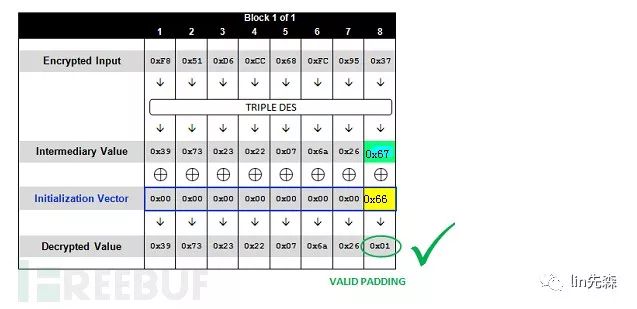 如上图所示,明文填充了四位时,如果最后一组密文解密后的结果(Intermediary Value也就是中间值)与前一组密文(Initialization Vector也就是IV值)异或得到的最后四位是0×04,那么服务器就会返回可以正常解密。