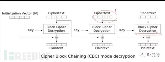 3.利用异或运算的性质,我们把我们构造的密文的最后一字节与0×01异或便可得到最后一位密文解密后的中间值是什么,这里我们设为M1,这一过程其实就是对应下图CBC解密过程中红圈圈出来的地方,1就是我们想要得到的中间值,二就是我们构造的密文也就是最后一组密文的IV值,我们已经知道了plaintext的最后一字节是0×01,从图中可以看到它是由我们构造的IV值与中间值的最后一字节异或得到的;