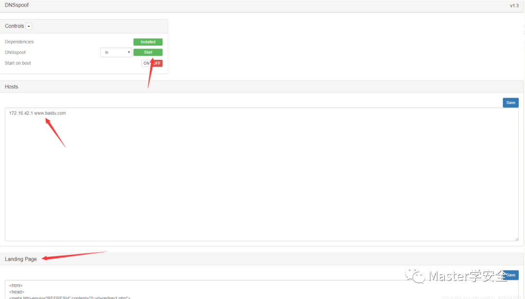 在hosts栏中进行配置和平时的hosts文件一样编辑即可,图中所示会将www.baidu.com指向172.16.42.1这个ip。Langding Page可以自定义跳转后的页面,需要注意的是这个模块会和其他的一些模块产生冲突。此处可以填写内网配置好的钓鱼服务器,也可以指到Pineapple,并在上面搭建服务